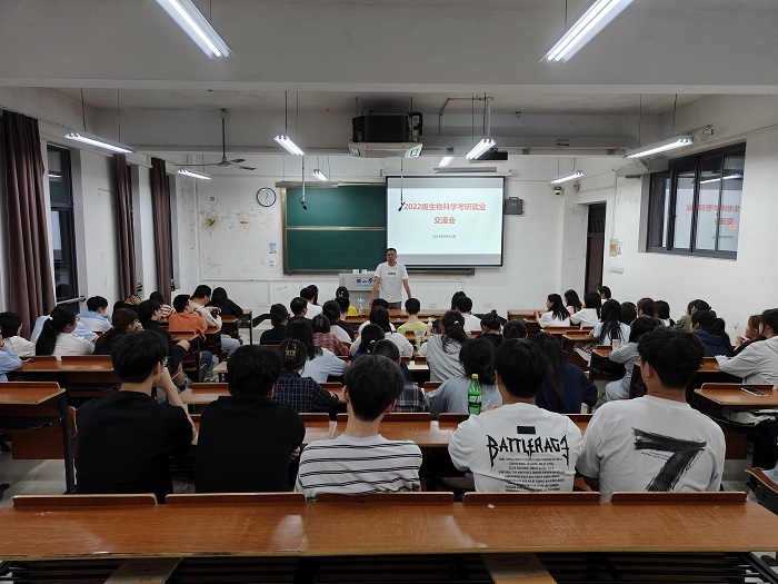 为帮助低年级学生科学规划未来,5月12日,生物科学专业在文渊楼1201成功举办考研、就业经验分享会,为学弟学妹传经送宝,搭建交流平台。生物科学专业在校生100余人参加了此次交流会,生物科学教研室副主任于超主持会议。