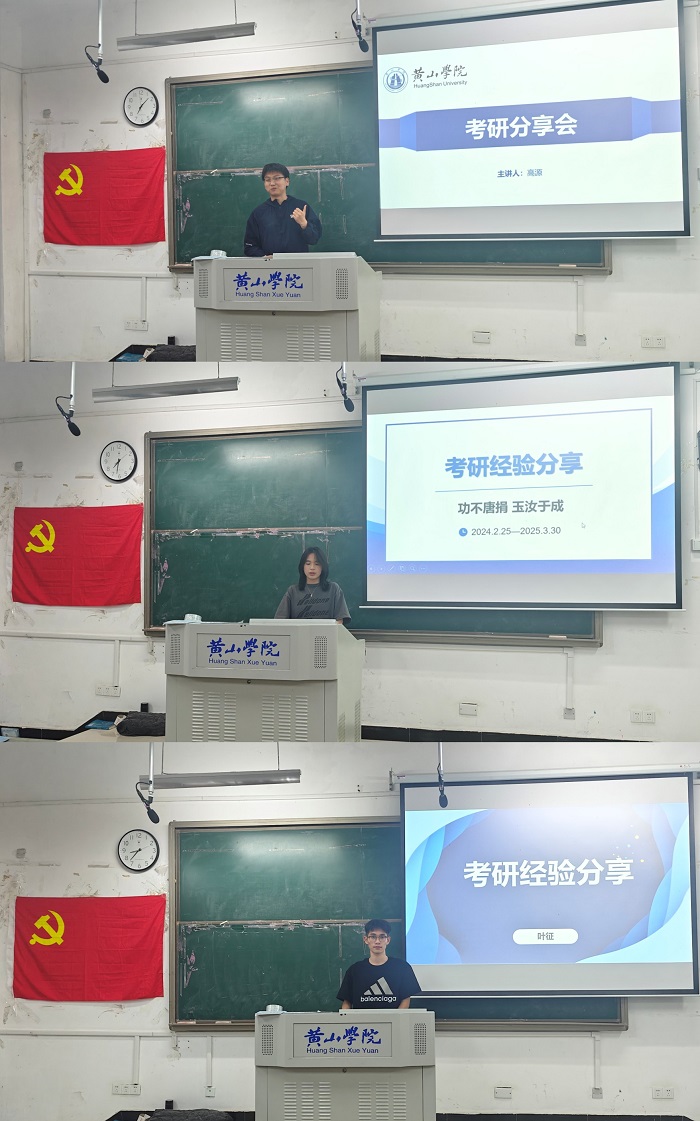 随后,高源(福州大学),吴雨薇(南京农业大学),叶征(浙江工业大学)等同学分别结合自身实践经历,毫无保留地分享了考研全过程的宝贵经验。 他们就考研择校讲起,分析如何依据自身实力与兴趣锚定目标;深入探讨学习计划制定的“时间管理术”,分享如何合理分配各科目复习时间;细致传授高效学习方法,如知识点框架构建、错题整理技巧等;还详细介绍了复试调剂的关键要点与考试过程中的注意事项。这些源于实战的经验,犹如一盏盏明灯,为备考学生照亮前行之路。最后,在提问交流环节,2022级同学们针对自身目前的困惑提出了问题,学长学姐们倾囊相助,耐心地一一解答。