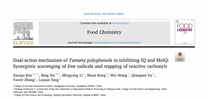 我校yl6776永利集团教师任晓镤、李明杨在工程技术领域权威Top期刊《Food Chemistry》(中科院1区,IF=9.8)发表了题为“Dual-action mechanism of Tamarix polyphenols in inhibiting IQ and MeIQ: Synergistic scavenging of free radicals and trapping of reactive carbonyls”的科研论文。