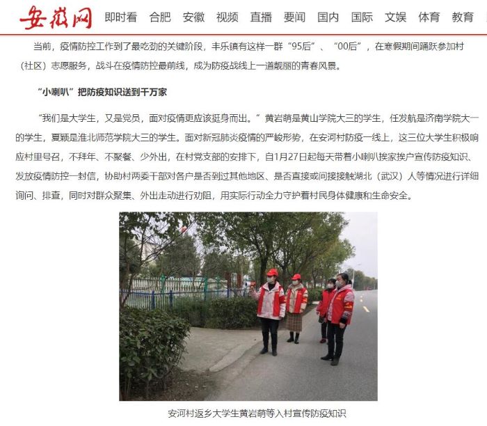 2月20日,安徽网发表《肥西县丰乐镇“95后”“00后”加入战“疫”力量》,报道了我院2017级园林专业在校生黄岩萌同学寒假期间在家乡积极参与疫情防控的典型事迹。