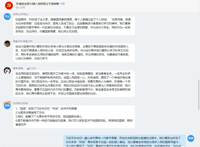 3月23日下午,我院环境党支部利用钉钉平台开展确定入党积极分子线上述责答辩活动和支部专题学习会。支部全体党员、入党积极分子代表及答辩对象共43人参会,会议由支部书记王雅楠主持。
