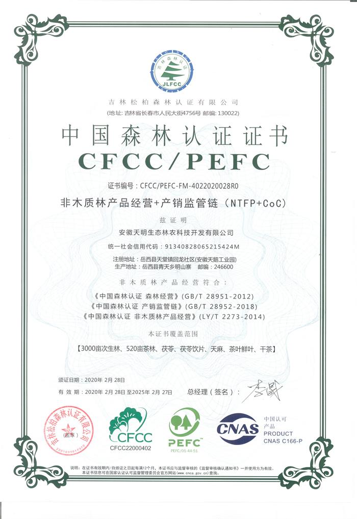 天明公司成为继我院支持的旌德县天山绿色食品有限公司后安徽省第二家获得森林认证证书的非木质林产品经营企业,也是自新冠疫情暴发以来,国内首家获得森林认证证书的企业。目前项目组已经协助企业完成CFCC/PEFC认证产品标识申办工作,预计今年新茶可实现贴标销售。这将在当地林农产业产生深远影响,对大别山区乃至安徽省森林可持续经营事业都起到积极示范带动作用。
