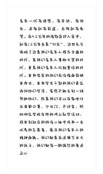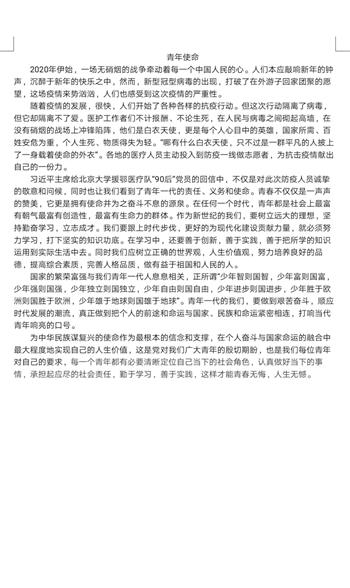 在新冠肺炎疫情防控斗争中,祖国的医护“天使们”不畏艰险、冲锋在前,习近平主席也对他们表示赞许。18林学班特此号召班级同学学习《习近平给北京大学援鄂医疗队全体“90后”党员的回信》,并积极交流自己的学习感悟。同学们将自己的所感所想通过文字的形式表达出来,致敬那些无私奉献的防疫逆行者!