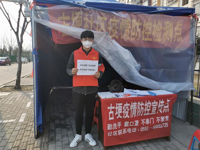 17级入党积极分子丁俊伟积极参加肥西县上派镇张郢一期安置点志愿服务工作。从早上8点到11点,下午2点到5点协助社区工作人员做好外来人员劝返及人员出入登记工作。他说,作为一名新时代的大学生,每天看着新闻里面的疫情动态都很难受。我们无法像白衣天使那样在一线保卫武汉,但我们可以尽自己的一份力守卫自己的家园,我们终将会克服难关,共同迎接新春到来。