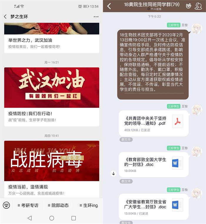 我院成立了疫情防控工作领导小组,层层落实责任,实现上下联动,每日关注疫情数据、摸排学生信息、开展宣传教育,牢牢筑起学生防控的防线。全体辅导员通过线上开展学生管理工作,通过微信公众号、家长群、学生群等网络渠道,充分发挥学生干部作用,实行班长负责制,建立“学院—班级—宿舍”三级联动,积极开展疫情防控教育,向学生及家长宣传普及疫情防治知识和学校防疫工作要求,落实好“全体学生不得提前返校”的工作部署,引导学生从我做起、加强防护,理性认识和科学对待疫情,切实增强自我保护意识和能力,不恐慌、不信谣、不造谣。勠力同心,坚决打赢这场没有硝烟的疫情防控阻击战。