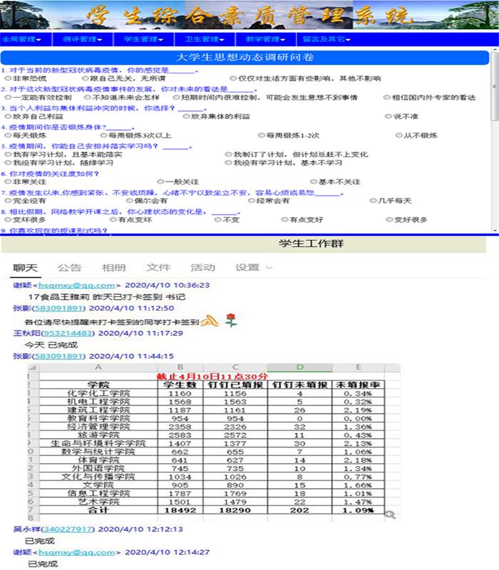 为推动疫情防控各项工作落地落实,我院通过每天的钉钉打卡、签到准确掌握学生动态,认真研判学生每日健康填报数据,精准施策。通过问卷调查、电话访谈等形式开展思想动态调研,全面地了解疫情防控期间学生的工作学习、生活、实践、见闻与感悟等,听取学生对线上教学的意见和建议,保障学院疫情防控各项工作全面扎实推进。