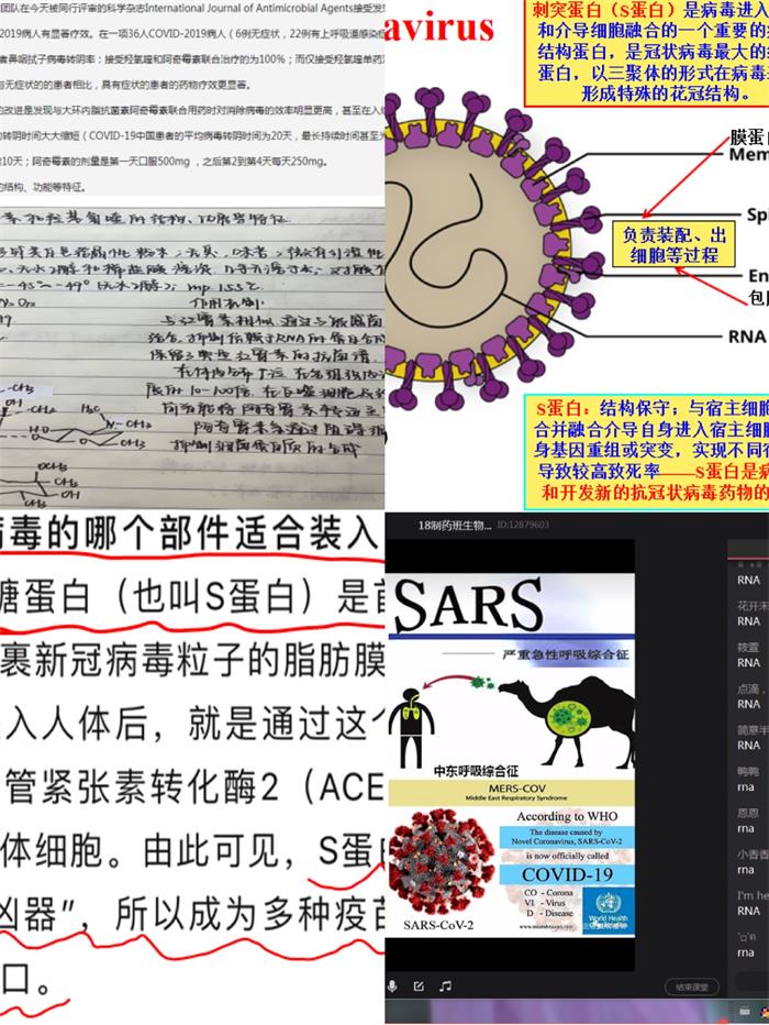 课程思政是学生成长的需求,当老师真正做到课程思政后,课堂就会有温度。疫情当前,生物技术专业的教师将专业紧密结合疫情,将“学以致用”的课程思政融入线上教学。目前全世界均在研发治疗新冠病毒肺炎的药物,而来源于天然产物的小分子药物有一定疗效,如氯喹、阿奇霉素均为生物碱类小分子成分,毕淑峰老师讲授天成产物化学课程的生物碱这章结束时,布置了相关课后作业,内容既结合疫情实际,又提高了学生的学习兴趣。胡晓倩老师在给生物技术和制药工程专业学生讲授《生物化学》课程时,通过QQ群课堂讲课和学习通的课堂活动小测验,让学生明白了新型冠状病毒的致病机理和疫苗研发的科学思路。