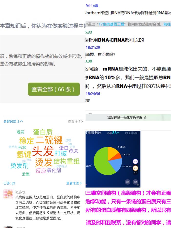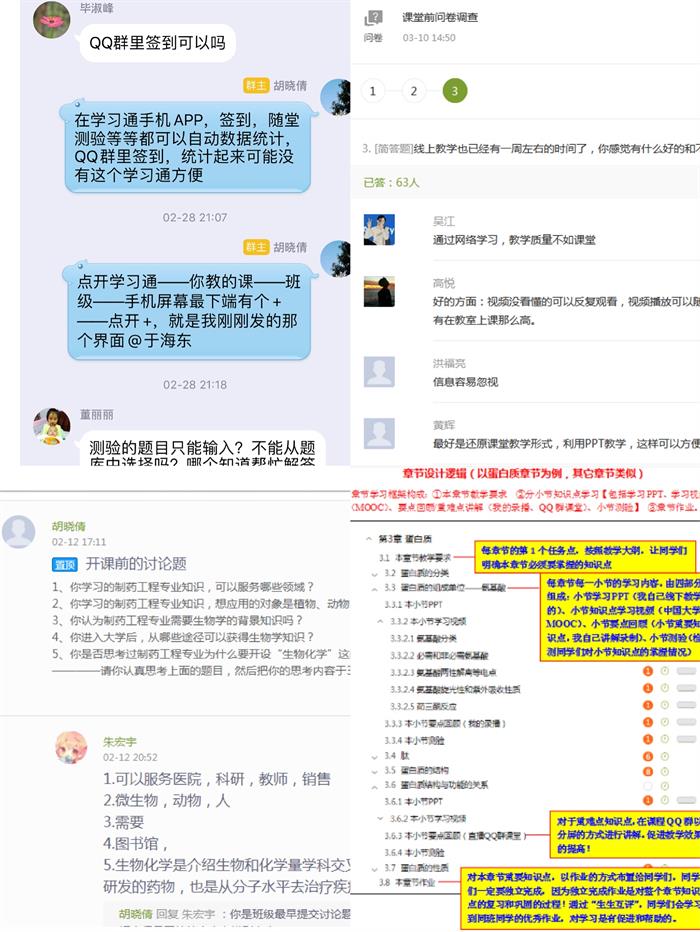 生物技术教研室的课程大多数是在3月2号开课的,在开课前就如何有效进行线上教学,老师们在生物技术教研室QQ群开展了热烈的探讨,相互学习。董丽丽老师在细胞工程课程开课前,通过问卷调查的形式询问了学生对线上教学的建议和意见。为了让学生明白为什么要在制药工程专业开设生物化学这门课程及其在制药工程专业培养中起着什么作用,在开课前胡晓倩老师组建了5个层层递进关系的小问题,让学生开展讨论并进行了总结,同学们深刻认识到学好生化、用好生化,对制药工程专业的重要性。同时,在开课伊始,任课教师就明确告知同学们课程每个章节设计的逻辑和任务点发放的时间安排,让学生明白每个任务点是为什么存在为什么是必要的,而且树立明确的学习时间观念,学生才能更好地去主动学习课程知识点。