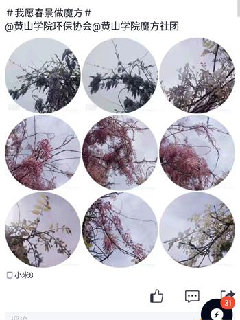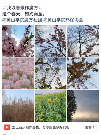 活动期间,同学们在工作人员的要求和指导下,拍摄9张美丽的春景图,将其拼凑成类似魔方的九宫格样式并在规定时间内发布带有指定话题的说说。随后,由工作人员整理、审核并将筛选出的优秀作品发布在官方QQ平台上分享展示。同学们积极参与活动,在线上展开了热烈讨论。