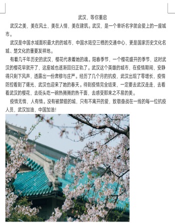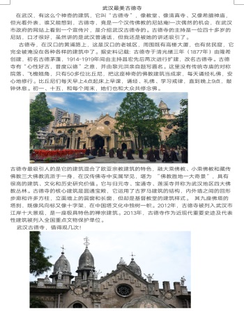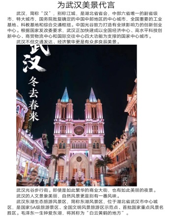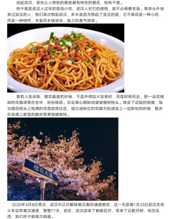 随着武汉的解封,武汉人民也在慢慢恢复往常的生活。为了让更多的人了解武汉、爱上武汉,该院特意举办了此次活动。活动要求同学们以图片和文字相结合的形式宣传武汉特色。大家自行上网寻找心目中最具武汉特色的美食或者风景图片,再结合自己的感受完成作品。热腾腾的热干面、武汉大学校园里的樱花雨、历史悠久的亭台楼等等,这些出现在参赛者作品里的实物都突显了最真实的武汉,也是同学们心中最美的武汉。活动中,同学们积极参与,线上气氛十分活跃。