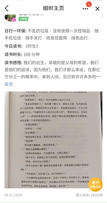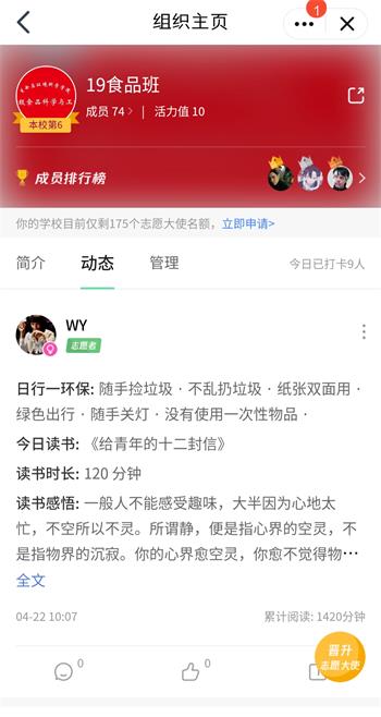 4月22日是世界地球日、4月23日是世界读书日。为了提高同学们的环保意识,营造良好的读书氛围,19食科班结合QQ小程序以线上打卡的形式开展了此次活动。活动要求同学们利用空闲时间向亲人及周围的朋友普及环保知识,并在QQ小程序“绿色地球志愿者联盟”下进行打卡。同时日读一书以丰富学识,增强自律能力。活动过程中,同学们纷纷晒出自己普及环保知识的过程和读书感悟,并表示在此次活动中提高了自身环保意识,表明会将所读之书、所学之识深刻落实,做到知行合一。