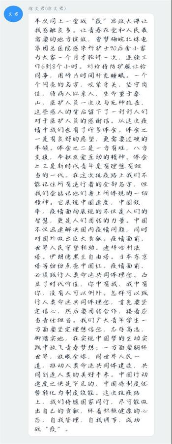 在辅导员王秋阳的带领下,同学们首先自行观看直播,专家们精彩解读了国家疫情防控硬核举措,科学分析疫情防控中彰显的中国共产党领导和中国特色社会主义制度显著优势,紧密结合安徽抗疫生动实践,深情讲述了我省医疗队支援湖北抗疫一线的动人事迹。之后,同学们在线上热烈讨论,大家纷纷表示从5位专家的讲课中看到中国在这场伟大斗争中展示出的非凡的执政魄力,受益匪浅。