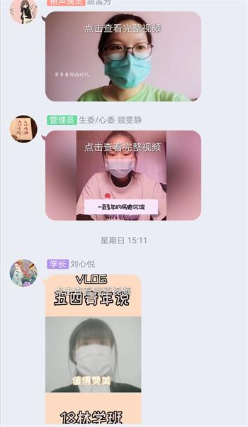 活动要求同学们拍摄朗诵弘扬五四精神相关文章的视频。活动期间,同学们积极在班群中发布视频,同学们深情并茂,精心挑选文章来表达对先辈崇高的敬意和对五四精神的理解,充分彰显出青年学生的精神面貌。活动后期,班委们负责审核活动视频,评选出优秀的作品后剪辑合成并发布到班级官Q以及微信公众号予以展示。