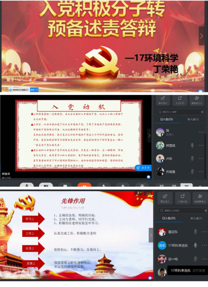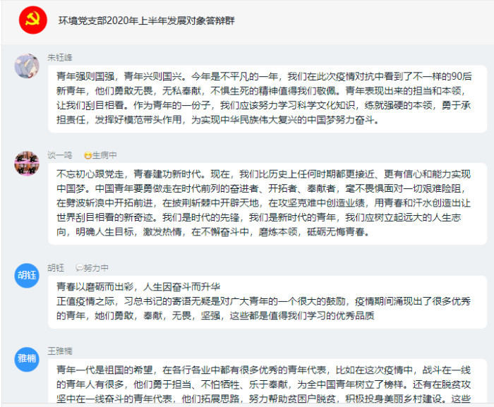 5月10日下午,我院环境党支部利用钉钉平台开展2020年上半年确定发展对象线上述责答辩活动暨支部5月专题学习会。支部全体党员和答辩对象共25人参会,会议由支部组宣委员王秋阳主持。