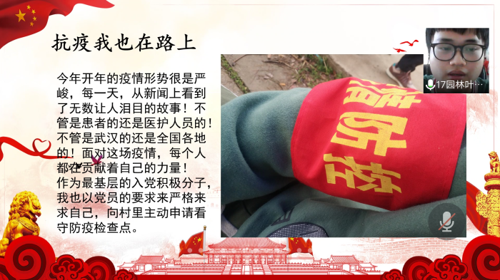 会议分为发展对象答辩和身边“优秀共产党员”投身战疫一线的故事分享两个流程。首先,14名入党积极分子按照既定的顺序,依次结合自己在思想、学习、工作和生活等方面的表现进行了个人情况汇报。随后各位评委围绕入党动机、疫情期间的积极分子作用发挥等问题,对答辩人进行了提问,全方位地考核了答辩对象的情况。接着每班代表进行故事分享,在一个又一个故事中,我们感受到了90后担起的力量以及他们所带来的朝气蓬勃。