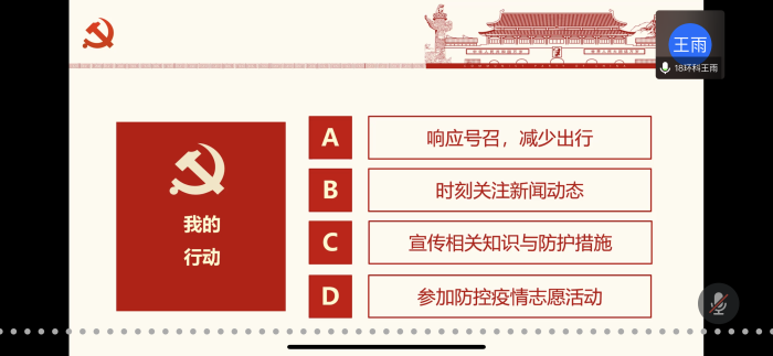 报告会采用线上视频交流的形式进行,由17生科班高贤、18生技班邱阳、18环科班王雨、19园林一班李欣怡四名学生代表向大家介绍疫情期间自身的志愿服务经历以及防疫的相关知识。活动过程中,同学们看到了疫情中中国青年的面貌,纷纷表示要努力学习,时刻准备为国家和社会献出自己的一份力量。疫情期间,我院优秀学子响应国家号召,积极参加志愿活动,向身边社区宣传疫情防控知识。他们用真挚的语言讲述了中国人民众志成城抗击疫情的故事,用自己的亲身实践诠释了青年人的担当,传递青春正能量。