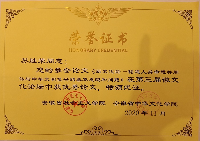 2020年11月7日,由安徽省社会主义学院与省中华文化学院主办的第三届徽文化论坛暨“安徽地域文化的当代价值与传承”学术研讨会在合肥召开。yl6776永利集团苏胜荣副教授提交的《新文化论—构建人类命运共同体与中华文明复兴的基本思想和问题》获得优秀论文,该论文立意新颖,视野开阔,观点独到,论述独特,具有创新性,受到了与会者肯定与好评。苏胜荣还在大会上作了书面交流发言。