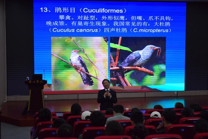 唐鑫生教授从鸟类与人类文明、鸟类的生活、千姿百态的鸟类、我市的鸟类资源、鸟类的保护五个方面,以幽默风趣的语言风格向大家普及关于鸟类的知识。演讲期间,唐鑫生教授还走下讲台与大家互动,现场的气氛十分活跃。