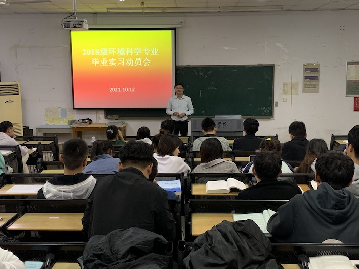 10月12日晚,18环境科学班成功举办2018级毕业生实习动员大会,18级环境专业全体同学参加了此次大会,会议由环境科学教研室主任马明海主持。