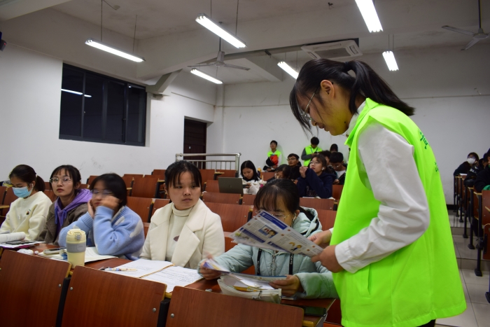 11月14日晚,生环学院志愿服务部在文渊楼1107、1109、1110等教室开展“肺结核知识科普”活动,参加此次活动的人员有21生技、21生科、21林学、21环科、21园林各班同学。