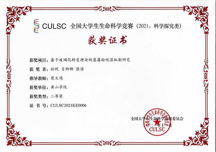 在创新创业类赛道比赛中,吴永祥指导的《“植”为你》项目荣获全国一等奖、《一种黄山臭鳜鱼的非热杀菌技术研究》项目荣获全国二等奖。在科学探究类赛道比赛中,楚文靖指导的《基于玻璃化转变理论的蓝莓粉吸湿机制研究》项目荣获全国二等奖,柏晓辉指导的《新安江流域抗生素耐药多样性调查及耐药基因组成分析》项目获得全国三等奖。