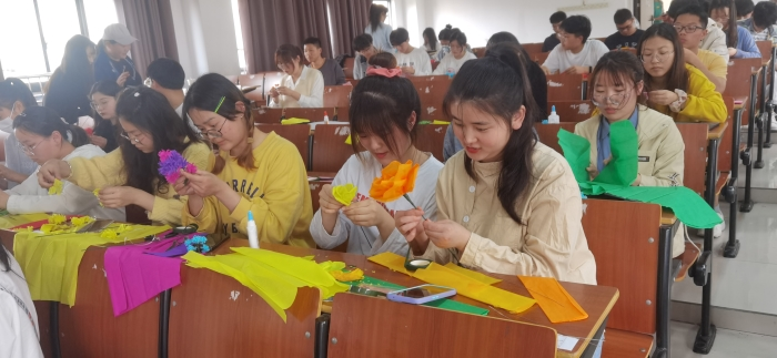 活动开始前,工作人员招集教学人员,并集中培训。活动伊始,参加活动的同学自由组队,工作人员分发褶皱纸、花杆、胶带等制作材料。活动中期,工作人员为大家演示教学,耐心讲解制作过程。活动后期,同学们根据所学内容加以创作,制作出属于自己的花束。