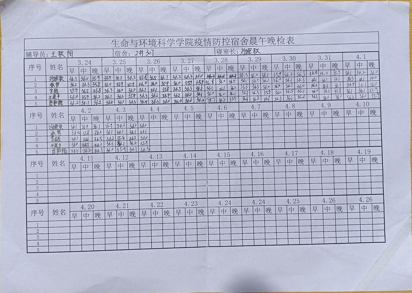 学院密切监测学生健康状况,严格落实晨午晚检制度,学生宿舍张贴晨午晚检台账记录表,寝室长负责督促寝室成员每天按时完成体温测量。学院加强日常教学检查,重点检查学生上课出勤及上课纪律情况,进一步贯彻落实因病缺勤缺课登记和病因追踪、复课证明查验等制度。