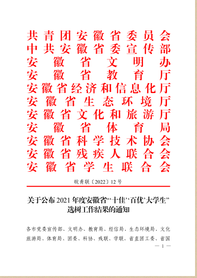 近日,由安徽省团省委、省委宣传部、省文明办等十一家单位联合举办的安徽省“十佳百优大学生”评选名单正式公布,我院学子储雷鸣荣获2021年自主创业类安徽省“百优大学生”称号,此前,储雷鸣同学也被评为“安徽省优秀毕业生”。