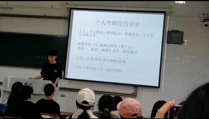 活动伊始,由林学教研室主任郑磊上台发言,指出本次交流会的目的是为正在准备2023年毕业的同学们提供已经成功上岸学长学姐的考研心得及就业实习经验,学习方法以及解答相关的疑虑、缓解同学们的压力。同学们热烈的掌声宣告本次考研交流会正式开始。首先由18林学班的同学上台进行经验分享,他们中有一志愿成功上岸分享学习方法的,也有调剂成功上岸分享考研心得的。他们都用最真挚的语言讲述自己的考研心路历程,从不同的方向分享一些经验,并祝愿23考研的林学人成功上岸。接着由20林学专升本的同学进行考研经验分享,他们也毫不吝啬的传授自己的考研心得,提供了很多学习方法和建议。在此期间,台下的同学们聚精会神,神情专注,在学长学姐们分享完经验之后积极举手提问,与学长学姐展开交流。活动结束之时,郑磊主任上台做总结发言:希望明年的你们也如今天的他们一样做“意气风发少年郎”,教室里掌声雷鸣。