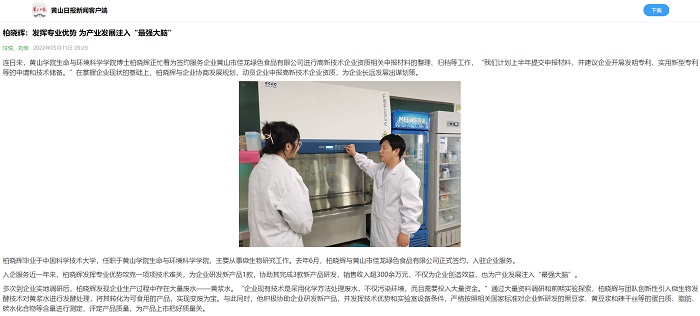 5月11日,《黄山日报》以《柏晓辉:发挥专业优势为产业发展注入“最强大脑”》为题,报道我院教师柏晓辉博士服务地方经济发展的事迹。柏晓辉博士以技术专长扎根地方企业,长期服务地方企业,助力企业发展。入企服务近一年来,利用技术优势创新性地将豆制品加工过程中产生的废水—黄浆水转化为产品,实现“废水”变“肥水”,助力企业绿色发展。柏晓辉发挥专业优势攻克一项项技术难关,已为企业研发新产品1款,协助其完成3款新产品研发,销售收入超300余万元,不仅为企业创造效益,也为产业发展提供智力支撑。
