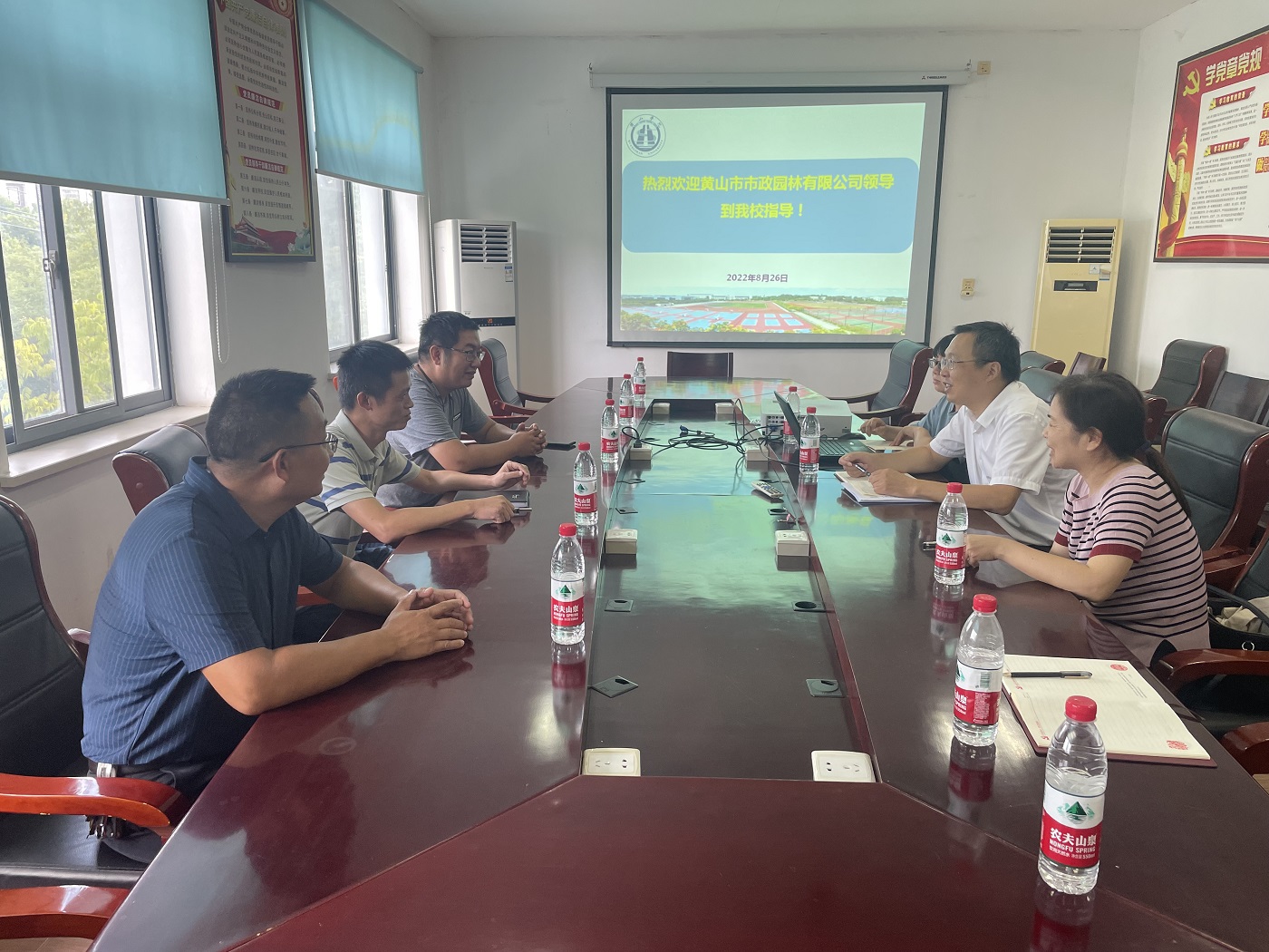 2022年8月26日下午,黄山市市政园林有限公司负责人汪辉等一行3人来yl6776永利集团洽谈合作,yl6776永利集团党委副书记万志兵、园林教研室、林学教研室相关老师参加座谈会。