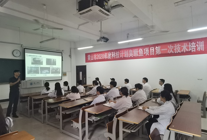 2022年7月11日,yl6776永利集团吴永祥、吴丽萍、陈飞、张蒙等4位食品专业教师在6776永利集团文端楼2102教室,结合黄山市科技计划项目《黄山臭鳜鱼品质控制关键技术研究及其副产物高值化综合利用开发》的实施,对黄山市胡兴堂桃花流水食品有限公司、黄山市超港食品有限公司、黄山市宴仙食品有限公司等技术人员20余人开展了臭鳜鱼加工技术的培训。