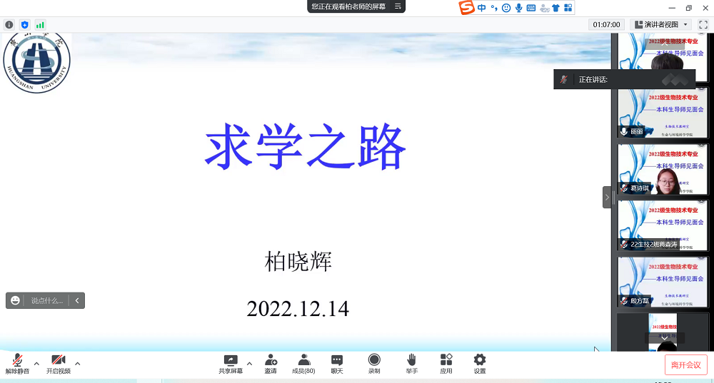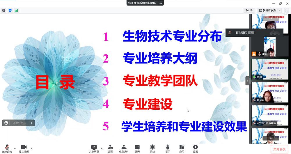 12月14日下午,生物技术专业利用腾讯会议召开了2022级本科生导师线上见面会。生物技术教研室全体教师、22级生物技术班全体学生参加了见面会。见面会由生物技术教研室主任董丽丽主持。