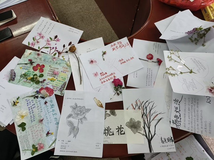 活动期间,同学们陆续来到现场,进行“心语”作品的创作。有些同学摘取了好看的树叶贴在纸上拼成“信物”,有些同学摘下心爱的花儿作为“信物”,活动现场洋溢着欢乐的气氛。此外,同学们还在自己的“信物”下分享开心和烦恼的事情,使每一个作品都增添满满的温度。