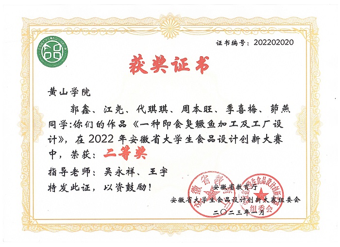 本次比赛共有来自省内29所高校的212件作品参赛。决赛分为新产品开发、工艺设计(新技术、新工艺)、产品创意(含包装设计、营销策划等)三个组别六个组进行。比赛中,参赛选手通过PPT和小视频从产品创意、加工工艺、产品评价等多个方面对作品进行了详细的介绍,并对评审专家的提问进行了答辩。最终,刘板、陈向阳指导、聂绍彭等同学的作品《美拉德肽—黄精风味黄山烧饼》获得一等奖;吴永祥、王宇指导、郭鑫等同学的作品《一种即食臭鳜鱼加工及工厂设计》,宁丙乾、杨蒙指导、李晨等同学的作品《祁门黄精茶》和吴丽萍指导、金涛等同学的作品《“青沐斋”系列青团》获得二等奖;胡长玉、姜薇、余腾飞、程子洋、潘雅燕等老师指导的作品获得省级三等奖。
