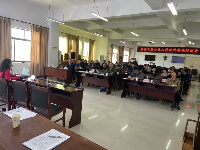 4月27日,yl6776永利集团教师潘健、苏胜荣、樊梅英受邀请,赴歙县农业农村局开展农业外来入侵物种普查技术培训工作。歙县农业农村局党组成员、副局长方培铭、歙县农业农村局科教股股长潘忠华及歙县28个乡镇分管农业领导及业务负责技术人员参加了培训会。