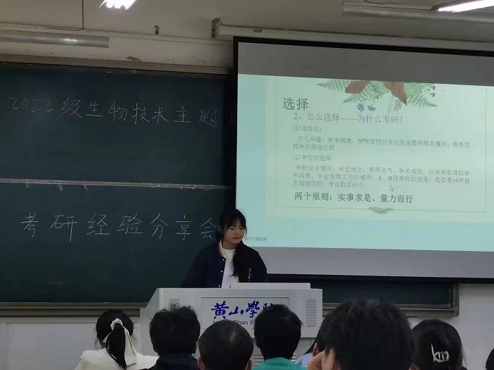 2023年5月23日,2022级生物技术班班主任柏晓辉和管观秀老师于文渊楼1104召开2022级生物技术主题班会暨考研经验分享会。柏晓辉邀请五位2023年成功考取研究生的生物技术专业同学进行经验分享,参加本次分享会有22级生物技术专业全体同学及部分21级、20级生物技术专业同学。