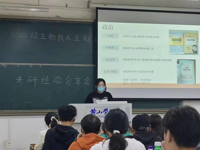 5位来自19生物技术班已被录取同学根据自己的经历为学弟学妹们分享宝贵的考研经验,他们分别从目标院校选择、考研复习时间安排、课程复习方法、如何抵制不良诱惑及调节考研焦虑等情绪等方面和大家进行分享;着重强调考研最重要的就是坚持,希望大家在考研路上克服浮躁,有步骤、有计划地准备考研,要坚持不懈,不要半途而废。