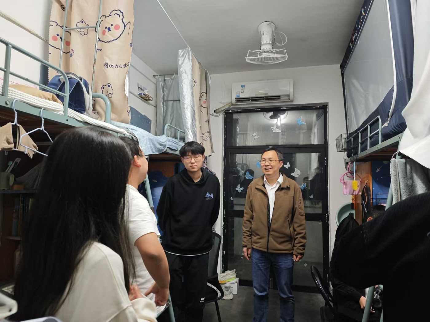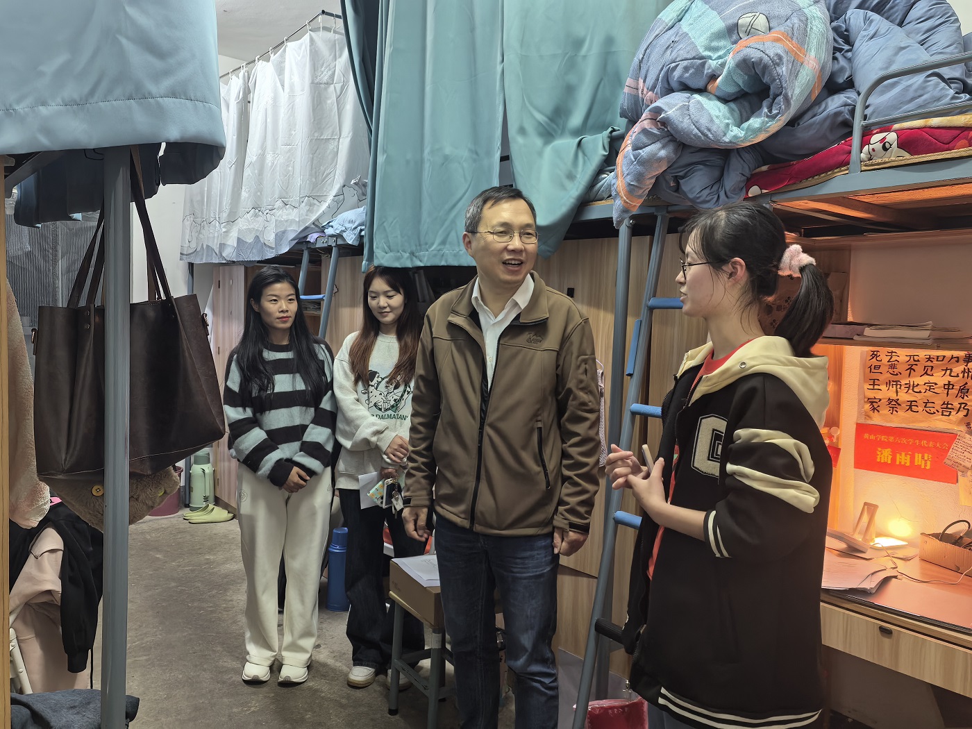 此次安全检查重点排查宿舍易燃物品、违规电器、人走不断电等用电隐患和其他火灾隐患。检查学生宿舍内是否存在私自使用大功率电器、私自乱拉电线等违规现象。在检查过程中,万志兵带领辅导员遍访宿舍,通过真实案例向同学们普及宿舍用电安全等相关知识,提醒同学们应时刻绷紧“安全”弦,遵守学校宿舍管理规章制度。同时他还提醒同学们要保持宿舍整洁,注意通风,预防疾病传播,强调学生们下载国家反诈中心APP,开启来电预警功能,及时识别诈骗电话和短信,学习反诈知识,增强防范意识,做到远离诈骗陷阱,守护好自己的财产安全。此外,万志兵就学习情况、未来规划、毕业生实习、就业情况等与同学们深入交流,了解同学们在学习与生活中遇到的问题并提出了可行建议。