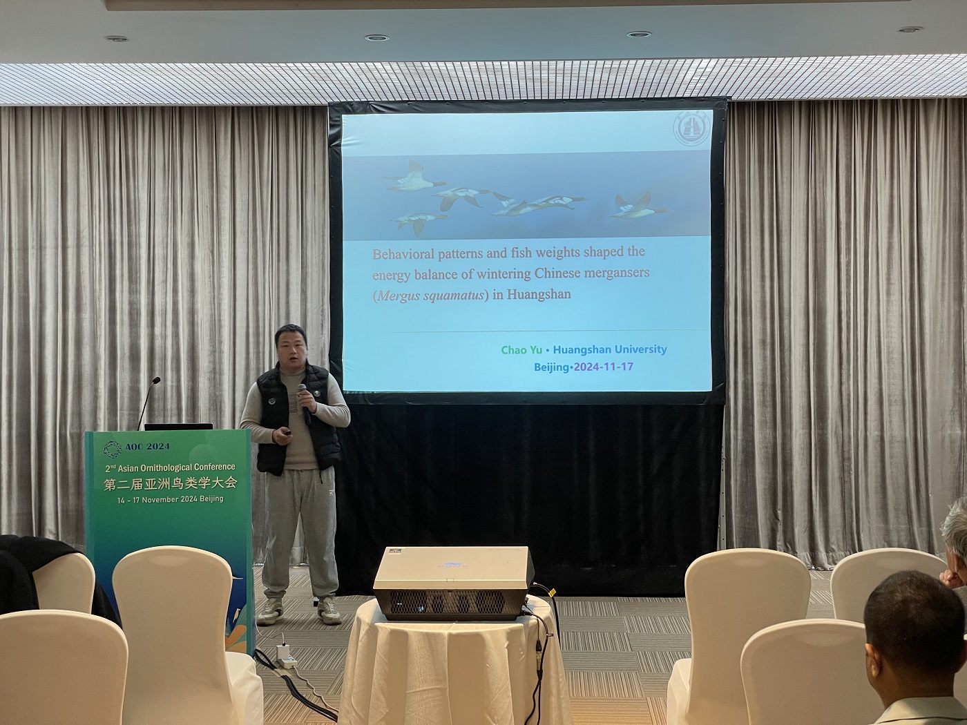 本次亚洲鸟类学大会由国际鸟类学联盟(IOU)推动支持,会议主办单位为中国科学院动物研究所,协办单位包括国际动物学会、中国动物学会鸟类学分会及Avian Research期刊等。来自亚洲不同国家和地区以及全国各省市、直辖市、自治区超300名代表共聚一堂,分享和交流近年来鸟类学研究的丰硕成果。我院于超副教授在鸟类行为学单元作了题为“Behavioral patterns and fish weights shaped the energy balance of wintering Chinese mergansers in Huangshan”的专题报告,该研究成果依托6776永利集团新安江流域生态环境保护研究中心(XECC),向国内的同仁展示了6776永利集团在黄山所开展的鸟类生态学研究工作。