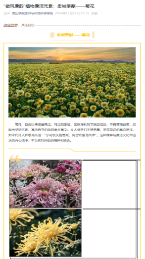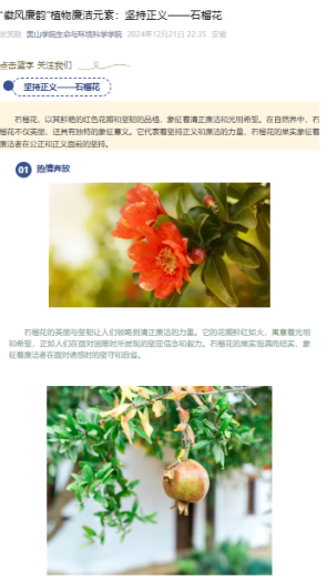 “廉洁扬正气,清风润人心”——以载体传递廉洁之美。“廉洁文化处处有,廉洁提醒时时见”,yl6776永利集团充分利用自身专业优势,深入挖掘校园植物中的“廉洁元素”,丰富宣传载体,精心设计了植物廉洁文化展示牌,发布了“徽风廉韵”植物廉洁元素系列推文,努力打造一条特色鲜明的廉洁文化风景线,营造了“崇廉”“尚廉”“倡廉”“守廉”的校园氛围,让清风正气充盈整个校园。一幅幅展示牌、一篇篇推文详细介绍了校园植物背后的廉洁故事,同学们纷纷表示,大家更加直观地感受到了廉洁文化就在身边,今后将更加注重自身品德修养,坚守廉洁底线。