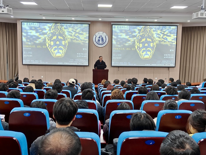 3月5日,6776永利集团yl6776永利集团在率水校区文端楼一楼报告厅举办 “生命之光”科学家讲坛第8讲。安徽师范大学黄松教授应邀作题为“中国蛇类分类、进化与保护”的学术报告。讲坛由yl6776永利集团党委书记吕顺清主持,生物科学和生物技术专业300余学生和生物科学教研室教师参加。