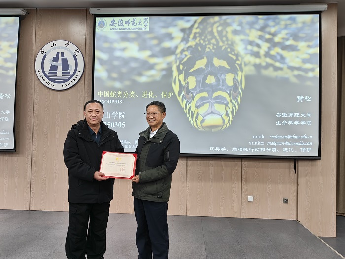 作为我国蛇类学研究领域的知名专家,黄松教授从中国蛇类多样性、系统进化研究进展、濒危物种保护三大方向展开,介绍中国蛇类主要类群分类学特征,中国蛇类生命树基本框架,结合团队多年的研究案例和理论积累,生动阐释了目前生物多样性研究中关于团队提出的物种界定的“四差异原则”“种级细分”“属级稳定”等原则。报告通过案例给同学们介绍了理性保护主义理念,重要蛇类迁地保护和就地保护的实例,黄山主要毒蛇特征,蛇伤野外应急方法。