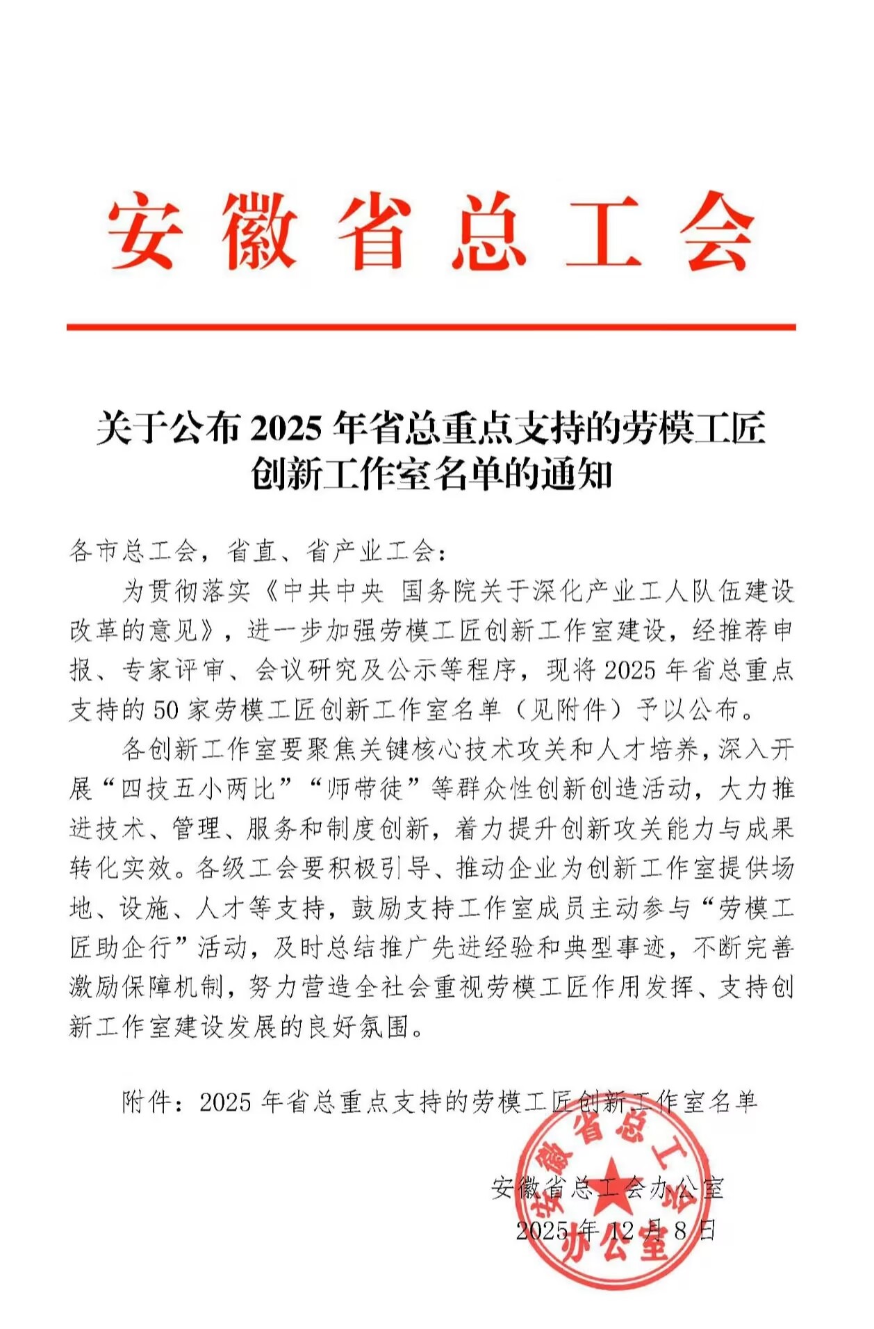 近日,安徽省总工会下发了《关于公布2025年省重点支持的劳模工匠创新工作室名单的通知》,我校赵昌恒劳模创新工作室入选2025年省重点支持的劳模工匠创新工作室名单。