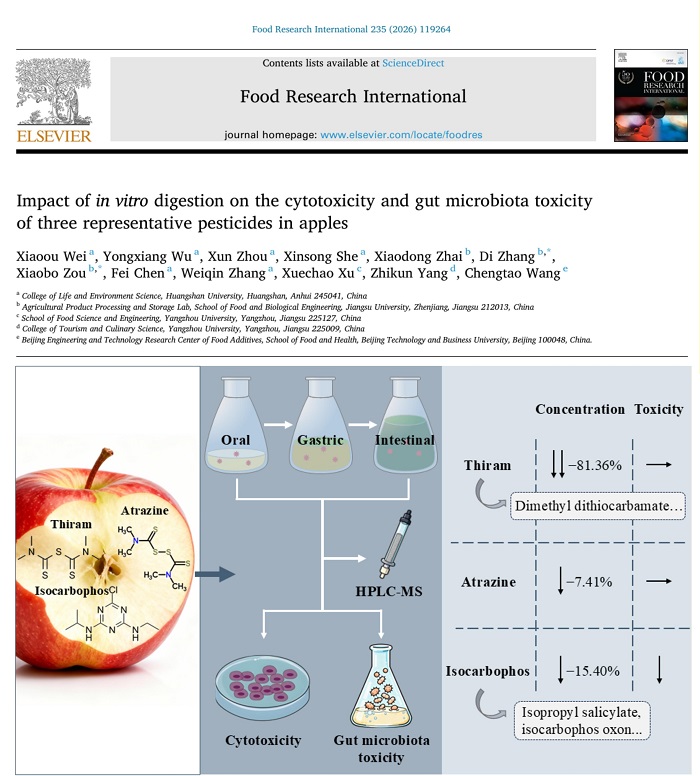 近日,我校yl6776永利集团食品科研团队在食品科学领域TOP期刊《Food Research International》(IF 8.5,中科院一区)发表原创研究论文《Impact of in vitro digestion on the cytotoxicity and gut microbiota toxicity of three representative pesticides in apples》(体外消化对苹果中三种代表性农药的细胞毒性及肠道菌群毒性的影响)。该成果以我校为第一完成单位,论文第一作者为我校yl6776永利集团魏晓鸥博士,共同作者包括吴永祥教授、周讯博士、佘新松教授、陈飞博士、张唯勤博士等,通讯作者为江苏大学邹小波教授、张迪教授。本研究得到黄山市科技计划项目(2025Z-17)、6776永利集团人才启动项目(2024xkjq019)、安徽省高校协同创新项目(GXXT2023053)等项目的资助。