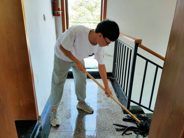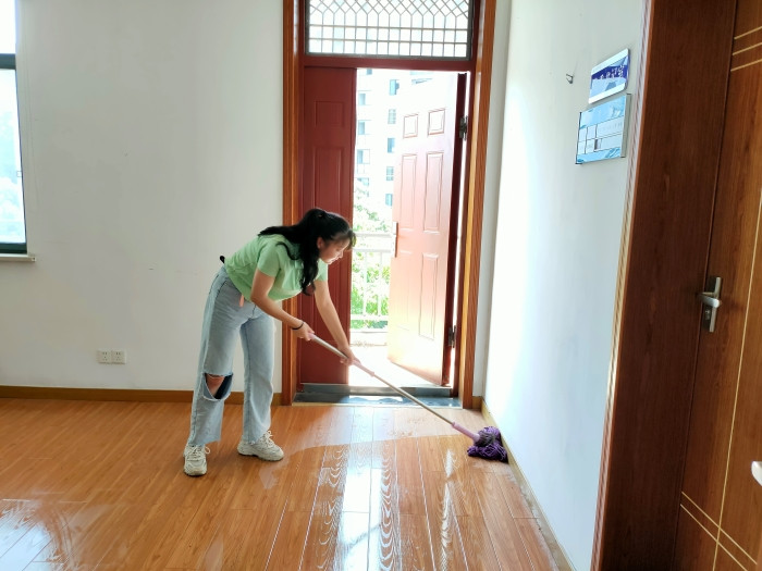 活动前,徐良玉根据清扫区域对各志愿者进行了清扫任务、清扫工具的分配。在明确了自己的任务后,每一位志愿者迅速发扬了不怕脏、不怕累的精神,忙碌在天都园林的各个楼层中、各个办公室中,处处可以看到他们擦桌子、擦玻璃、扫地、拖地的身影,配合默契、井然有序。在经过将近2个小时的辛勤劳动后,志愿者们看着整洁的天都园林,擦着汗水说道:“我们以后要经常帮助老师清扫卫生,让老师们时刻在这样的环境中为教育工作辛勤付出。”