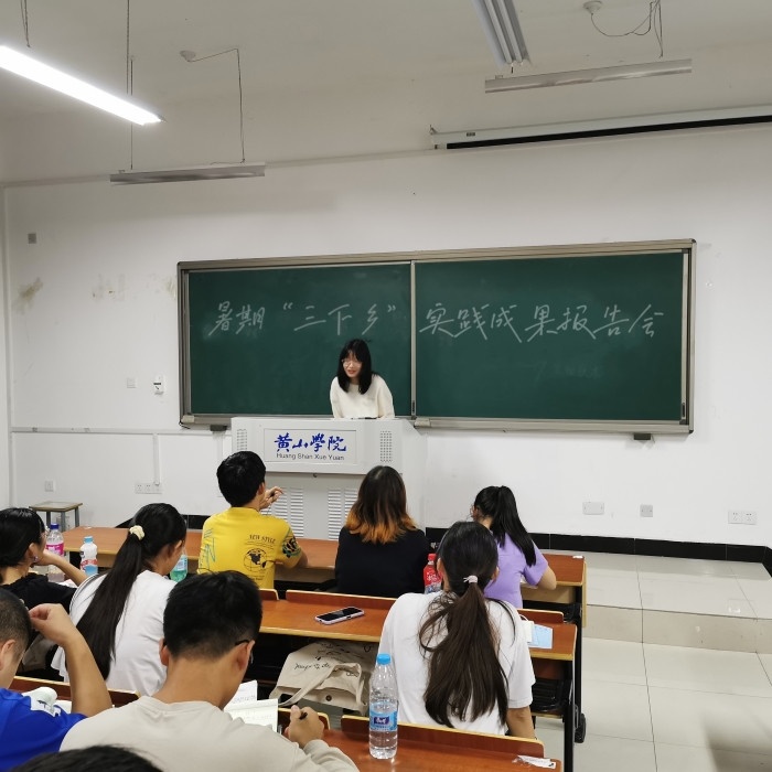 活动伊始,由该班参与暑期“三下乡”活动的文月同学进行成果分享。文月同学参与的暑期“三下乡”的活动主题是探寻红色故事,宣传红色精神。在学院的带领下他们前往休宁县革命老区开启了为期三天的实践活动,分别去到了休宁县山斗乡、商山镇、蓝田镇开展党史宣传教育活动,并且开展党史教育课、采访和慰问革命前辈、参观张起孟故居等一系列活动。随后,班级同学积极发表自己的观后感受,相互交流。