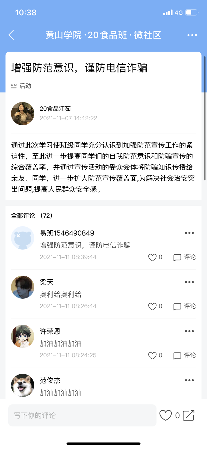 为切实做好易班网络文化月活动,做实班级安全宣传教育工作,11月8日-10日,20食品班利用易班平台举办“增强防范意识,谨防电信诈骗”安全主题活动。该班全体73名同学全部参加活动。