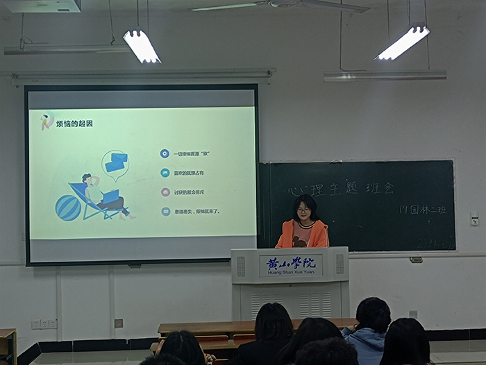 11月12日晚,该班学生在班级活动负责人的带领下,井然有序地开展了此次主题班会。本次班会的主题是“烦恼结,如何解”。在主题班会中,生活委员兼心理委员张紫悦就心理健康方面的问题进行详细说明,其中内容主要包括“生活中常见的烦恼”、“化解烦恼的途径”、“那些名人怎么自我排解”、“如何健康生活”四个方面。从该班同学平时经常遇到的困扰,到如何通过自我排解和与他人交流将心里的困扰以合理的方式渲泄出来;从名人保持心理健康的方法,到实际实施措施……班会内容生动易懂,互动交流的方式使人印象深刻。班会结束后,该班学生纷纷表示受益匪浅。