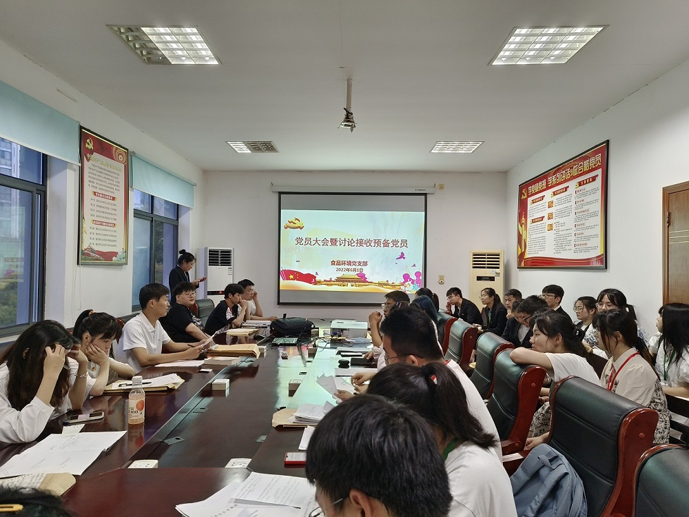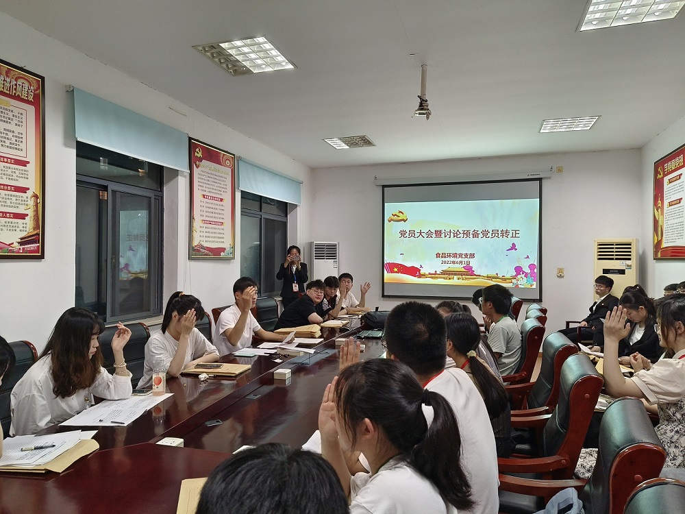 为做好党支部2022上半年党员发展工作,6月1日,食品环境党支部于天都园林三楼会议室召开党员大会,讨论接收2022年第二批中共预备党员及预备党员到期转正。党支部书记徐良玉、副书记王秋阳、组宣委员罗毅、纪检委员吴丽萍及支部48名学生党员参加会议。会议由徐良玉主持。